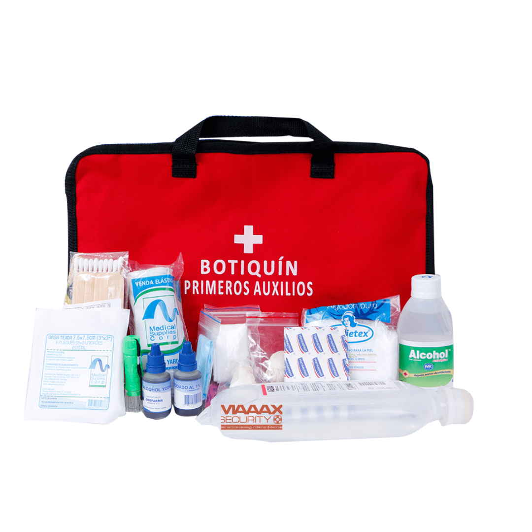 Botiquín de lona de primeros auxilios, de la marca MAAAXSEGURITY, con todos los productos exigidos por las leyes colombianas para seguridad en piscinas.