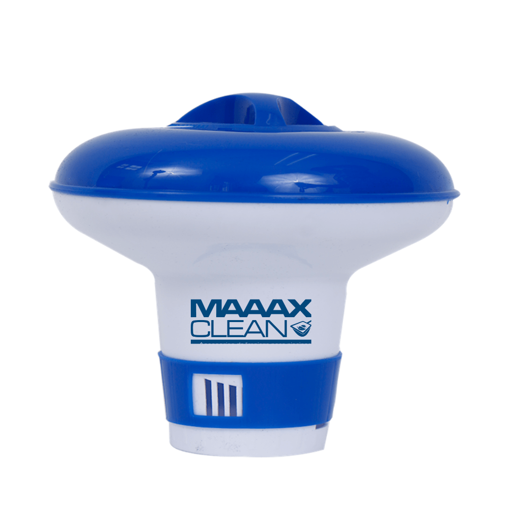 El dispensador de cloro de la marca MAAAXCLEAN, permite dispersar de manera efectiva tabletas de cloro 1” (20 gramos) por toda la piscina.
