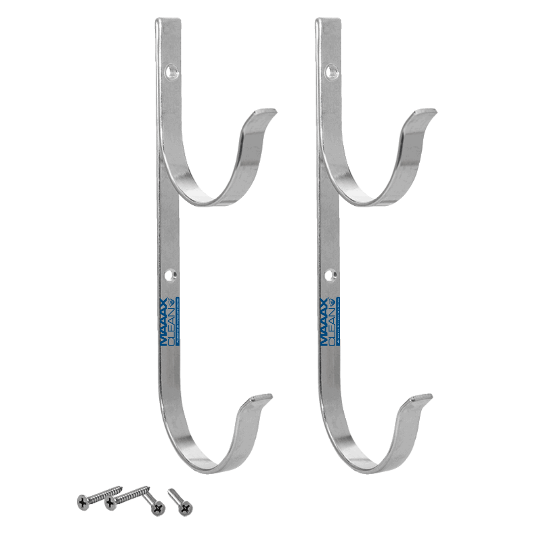 El set ganchos en acero inoxidable de la marca MAAAXCLEAN, es usado para ordenar tubos telescópicos de carros de limpieza, bastones de rescate o aros salvavidas en piscinas o espejos de agua.
